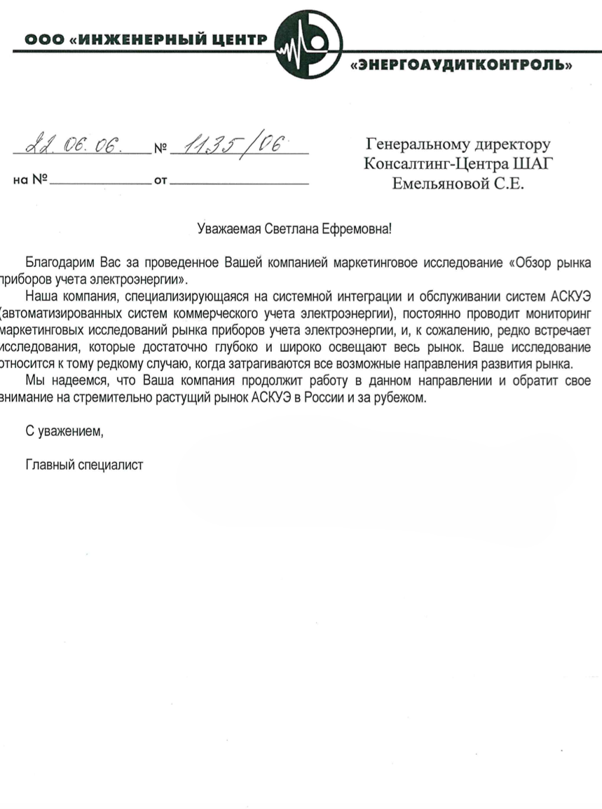 Благодарим Вас за проведенное Вашей компанией маркетинговое исследование «Обзор рынка приборов учета электроэнергии».