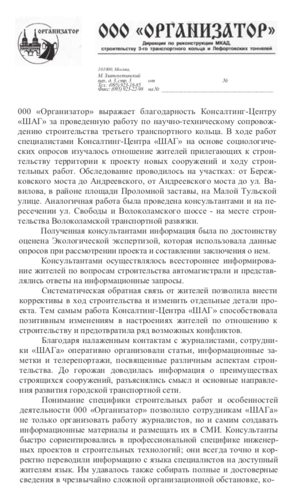 ООО "Организатор" выражает благодарность Консалтинг-Центру "ШАГ" за проведенную работу по научно-техническому сопровождению строительства третьего транспортного кольца. В ходе работ специалистами Консалтинг-Центра "ШАГ" на основе социологических опросов изучалось отношение жителей прилегающих к строительству территорий к проекту новых сооружений и ходу строительных работ. Обследование проводилось на участках: от Бережковского моста до Андреевского, от Андреевского моста до ул. Вавилова, в районе площади Проломной заставы, на Малой Тульской улице. Аналогичная работа была проведена консультантами и на пересечении ул. Свободы и Волоколамского шоссе - на месте строительства Волоколамской транспортной развязки.