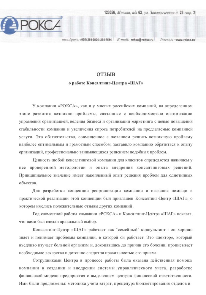Год совместной работы компании «РОКСА» и Консалтинг-Центра «ШАГ» показал, что нами был сделан правильный выбор.