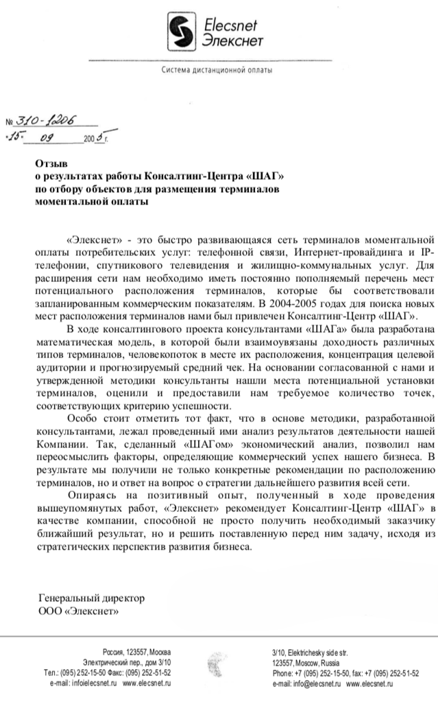 «Элекснет» – это быстро развивающаяся сеть терминалов моментальной оплаты потребительских услуг: телефонной связи, Интернет-провайдинга и IP-телефонии, спутникового телевидения и жилищно-коммунальных услуг. Для расширения сети нам необходимо иметь постоянно пополняемый перечень мест потенциального расположения терминалов, которые бы соответствовали запланированным коммерческим показателям. В 2004-2005 годах для поиска новых мест расположения терминалов нами был привлечен Консалтинг-Центр «ШАГ».