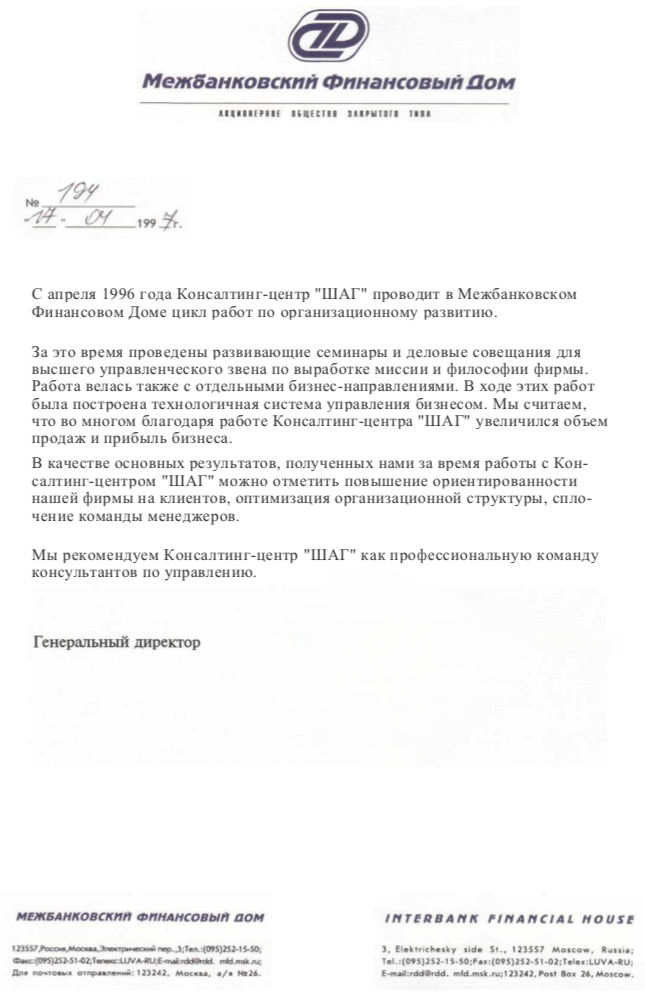 С апреля 1996 года Консалтинг-центр "ШАГ" проводил в Межбанковском Финансовом Доме цикл работ по организационному развитию.