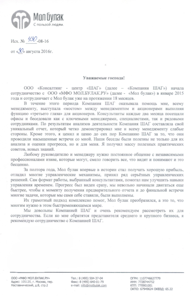 ООО «Консалтинг-Центр «ШАГ» (далее – Компания ШАГ) и ООО «МФО МОЛ.БУЛАК.РУ» (Далее – Мол булак) начали сотрудничество в январе 2015 года и сотрудничает уже на протяжении 18 месяцев.