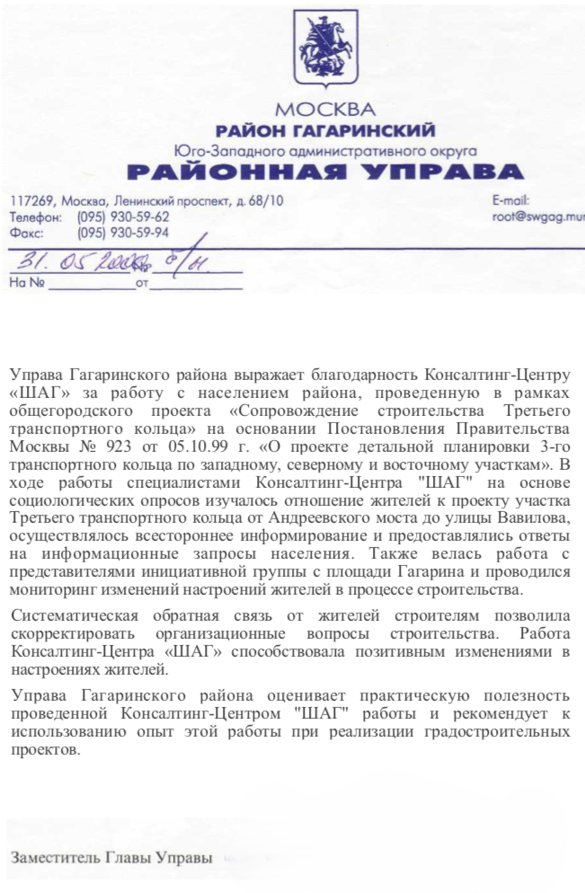 Управа Гагаринского района выражает благодарность Консалтинг-Центру "ШАГ" за работу с населением района, проведенную в рамках общегородского проекта "Сопровождение строительства Третьего транспортного кольца" на основании Постановления Правительства Москвы № 923 от 05.10.99 г. "О проекте детальной планировки 3-го транспортного кольца по западному, северному и восточному участкам". В ходе работы специалистами Консалтинг-Центра "ШАГ" на основе социологических опросов изучалось отношение жителей к проекту участка Третьего транспортного кольца от Андреевского моста до улицы Вавилова, осуществлялось всестороннее информирование и предоставлялись ответы на информационные запросы населения. Также велась работа с представителями инициативной группы с площади Гагарина и проводился мониторинг изменений настроений жителей в процессе строительства.