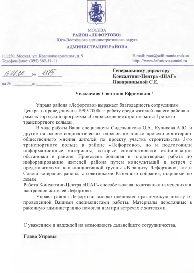 Управа района "Лефортово" выражает благодарность сотрудникам Центра за проведенную в 1999-2000 гг. работу среди жителей нашего района в рамках городской программы "Сопровождение строительства Третьего транспортного кольца".