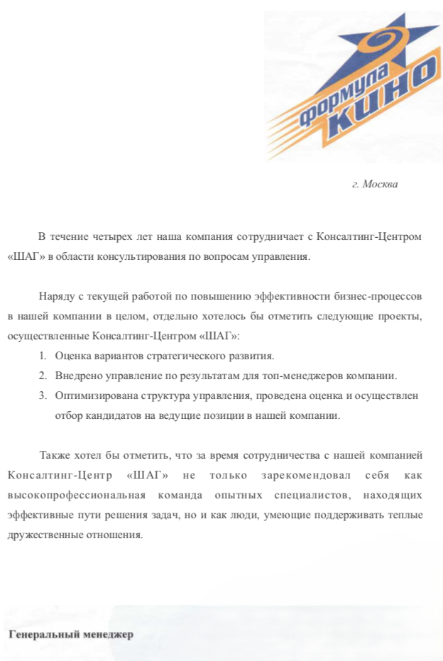 Также хотел бы отметить, что за время сотрудничества с нашей компанией Консалтинг-Центр "ШАГ" не только зарекомендовал себя как высокопрофессиональная команда опытных специалистов, находящих эффективные пути решения задач, но и как люди, умеющие поддерживать теплые дружественные отношения.