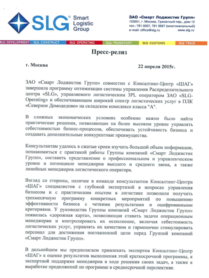 Полученный позитивный опыт позволяет ЗАО «Смарт Лоджистик Групп» рекомендовать Консалтинг-Центр «ШАГ», как команду профессионалов, способных в сжатые сроки увидеть суть проблемы и предложить смелые, но реалистичные пути её решения.