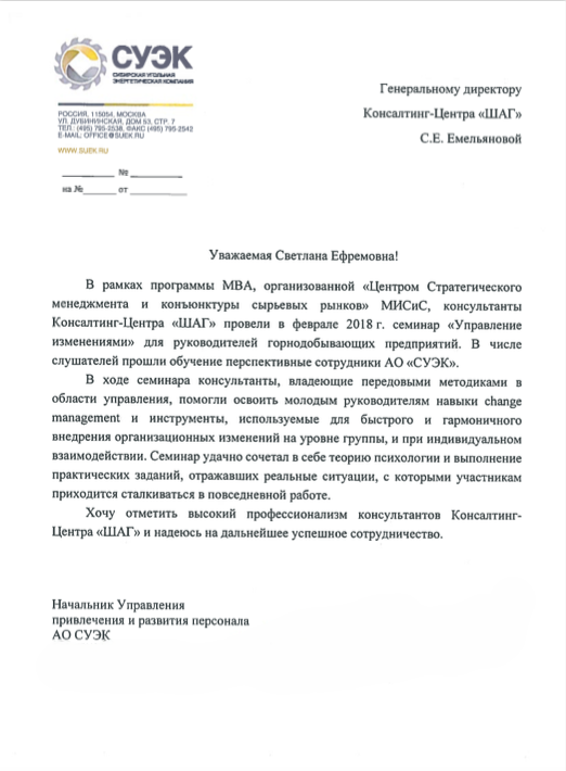 В рамках программы MBA, организованной «Центром Стратегического менеджмента и конъюнктуры сырьевых рынков» МИСиС, консультанты Консалтинг-Центра «ШАГ» провели в феврале 2018 г. семинар «Управление изменениями» для руководителей горнодобывающих предприятий. В числе слушателей прошли обучение перспективные сотрудники АО «СУЭК».