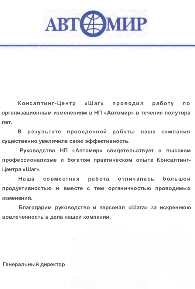 Руководство НП "Автомир" свидетельствует о высоком профессионализме и богатом практическом опыте Консалтинг-Центра "Шаг".