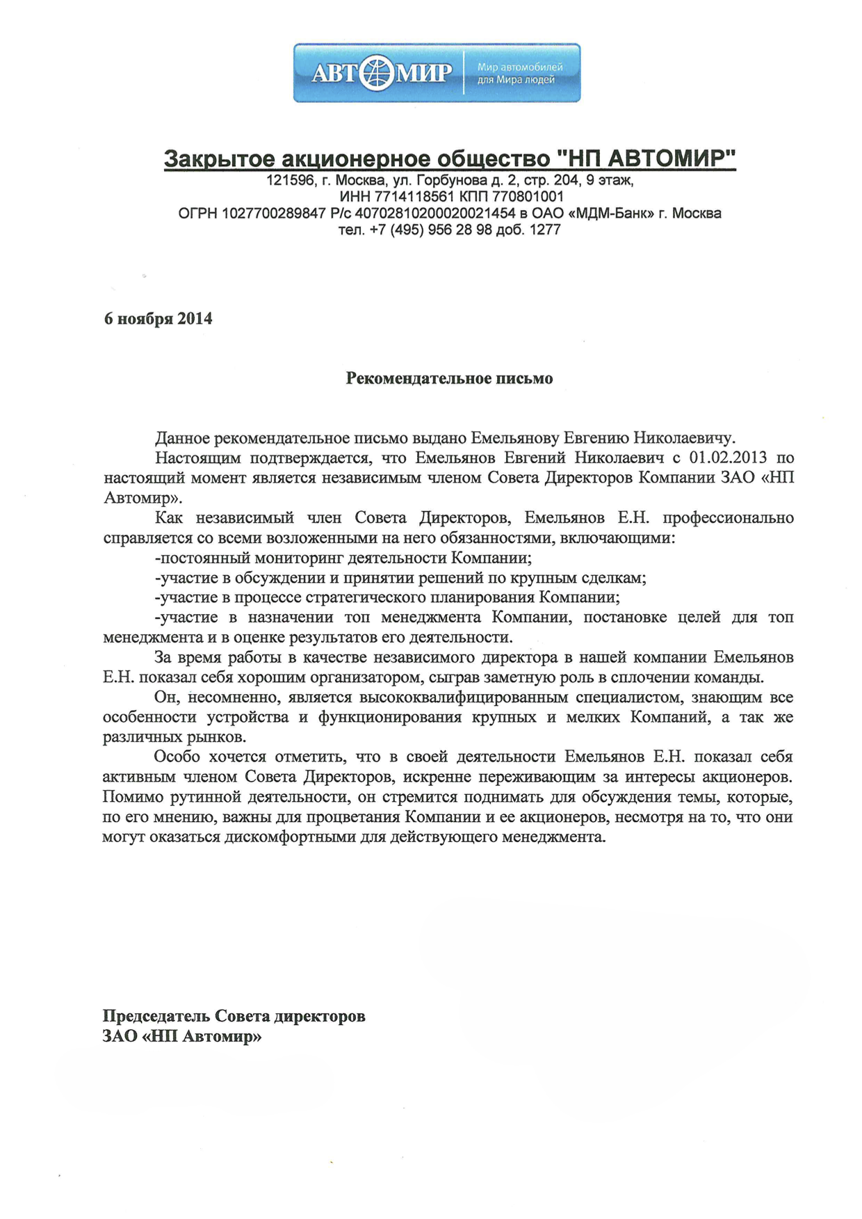 Данное рекомендательное письмо выдано Емельянову Евгению Николаевичу. Настоящим подтверждается, что Емельянов Евгений Николаевич с 01.02.2013 по настоящий момент является независимым членом Совета Директоров Компании ЗАО «НП Автомир».
