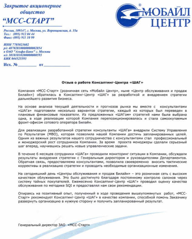 Компания «МСС-Старт» (розничная сеть «Мобайл Центр», ныне «Центр обслуживания и продаж Билайн») обратилась в Консалтинг-Центр «ШАГ» за разработкой и внедрением стратегии дальнейшего развития бизнеса.