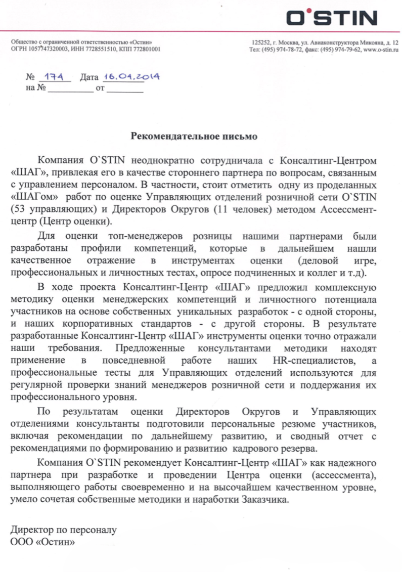 Компания OSTIN рекомендует Консалтинг-Центр «ШАГ» как надежного партнера при разработке и проведении Центра оценки (ассессмента), выполняющего работы своевременно и на высочайшем качественном уровне, умело сочетая собственные методики и наработки Заказчика.