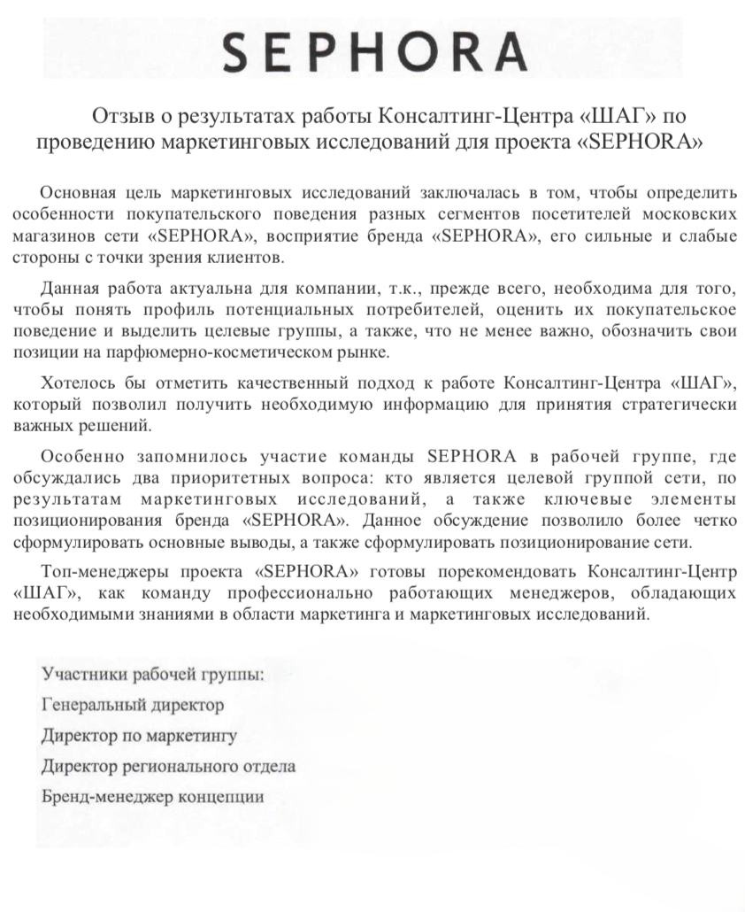 Топ-менеджеры проекта «SEPHORA» готовы порекомендовать Консалтинг-Центр «ШАГ», как команду профессионально работающих менеджеров, обладающих необходимыми знаниями в области маркетинга и маркетинговых исследований.