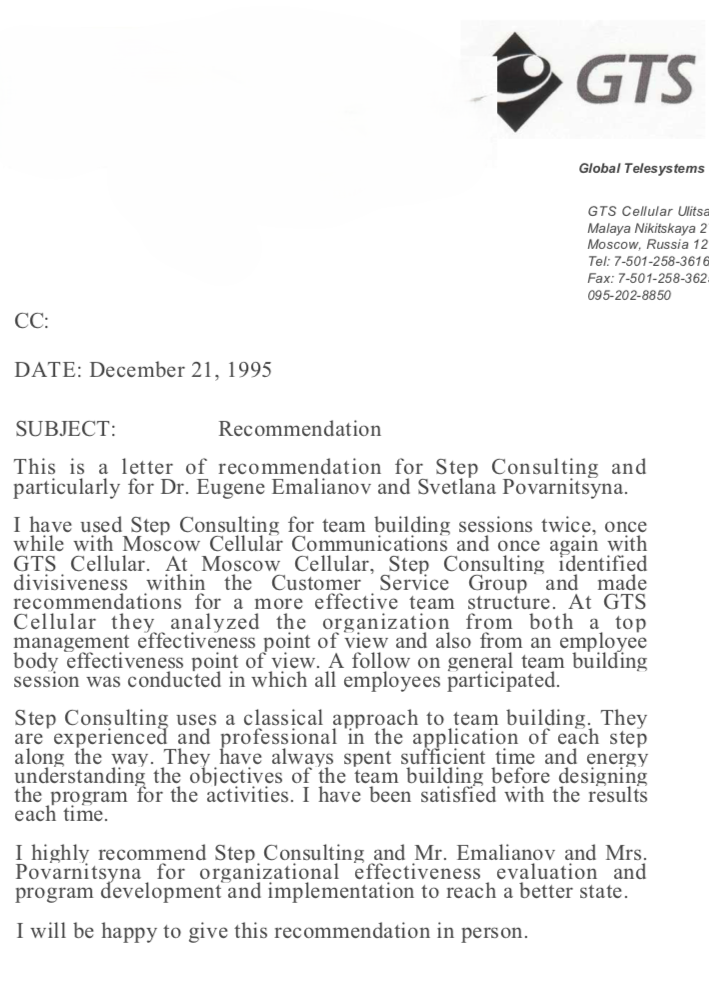 Консалтинговая фирма "ШАГ" дважды приглашалась мною для проведения работы по созданию команды: с Московской сотовой связью (Moscow Cellular Communication) и GTS сотовой связью (GTS Cellular). В ходе работы с Moscow Cellular Communication консультанты фирмы "ШАГ" идентифицировали подразделения внутри Группы по работе с клиентами и дали рекомендации по более эффективной структуре команды. В ходе консультативной работы с GTS Cellular специалисты консалтинговой фирмы "ШАГ" провели анализ организации как со стороны высшего руководства, так и со стороны основного персонала. Затем была проведена работа по созданию команды, в которой принимал участие весь персонал GTS Cellular.