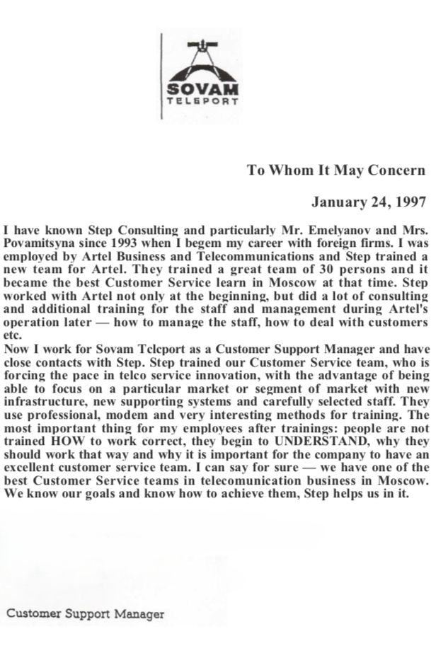 I have known Step Consulting and particularly Mr.Emelyanov and Mrs.Povarnitsyna when I began my career with foreign firms. I was employed by Artel Business and Telecommunications and Step trained a new team for Artel. They trained a great team of 30 persons and it became the best Customer Service Learn in Moscow at that time. Step worked with Artel not only at the beginning, but did a lot of consulting and additional training for the staff and management during Artel's operation later - how to manage the staff, how to deal with customers etc.
