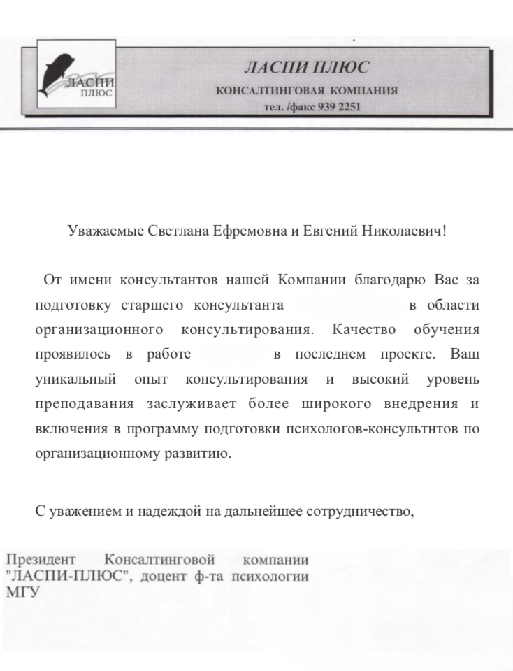 От имени консультантов нашей Компании благодарю Вас за подготовку старшего консультанта Зотовой Юлии в области организационного консультирования. Качество обучения проявилось в работе Зотовой в последнем проекте. Ваш уникальный опыт консультирования и высокий уровень преподавания заслуживает более широкого внедрения и включения в программу подготовки психологов-консультнтов по организационному развитию.